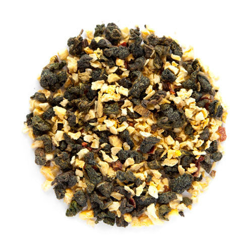 Only the mellow and complex flavor on an oolong can make this blend the pleasure it is. Peach Oolong is a Ti Kwan Yin, an oolong that imparts both a crispness and a smoothness, enhancing the the fruit-forward notes. The amount of actual dried peach in the loose tea is visually striking and brings the stone-fruit sweetness to the front. Notes of warmed raspberries and toasted melon seeds blend on the palate, lingering in a particularly long citrus finish. Brewed hot it's warming and exceedingly comforting. Brewed cold, it's sweet and smooth.