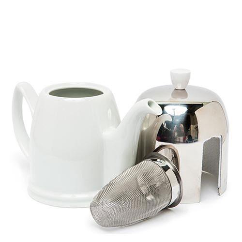 Form meets function in white porcelain and chrome. No wonder these modern French teapots by Guy Degrenne are a customer favorite! This classically shaped teapot is our most traditionally European option. Lift the chrome lid to reveal a felt cozy under layer on its interior - perfect for keeping your tea hotter, longer. Inside the pot is a deep, tightly woven stainless steel wire infuser basket with a sturdy, stationary handle. The Salam Teapots are available in four sizes: 2 cups, 4 cups, 6 cups and 8 cups.
